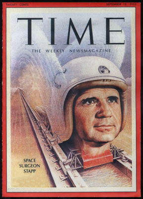 It was while at Holloman that Colonel Stapp noted that the Air Force lost nearly as many men in fatal auto accidents as in plane crashes. So, he began a car-crash study program, putting dummies into salvaged autos and projecting them into wood and concrete barriers. Human volunteers tested safety belts up to 28 g's or 4,800 pounds decelerative force.